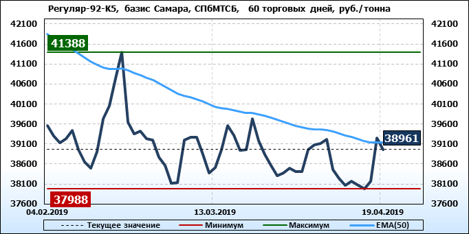 Цены на бензин Регуляр-92 класс 5, базис поставки Самара, торгуемые на СПбМТСБ, выросли за неделю на 793 рубля до 38961 рубля за тонну. Тренд на рынке бензина Регуляр-92-К5 на СПбМТСБ, базис поставки Самара, падающий.