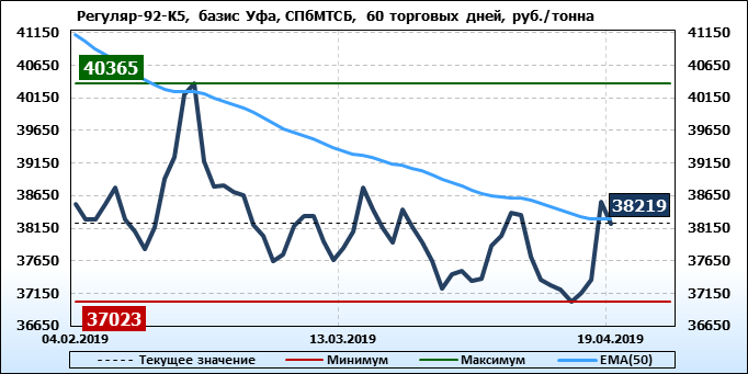 Цены на бензин Регуляр-92 класс 5, базис поставки Уфа, торгуемые на СПбМТСБ, выросли за неделю на 1013 рубля до 38219 рублей за тонну. Тренд на рынке бензина Регуляр-92-К5 на СпбМТСБ, базис поставки Уфа, направлен вниз.
