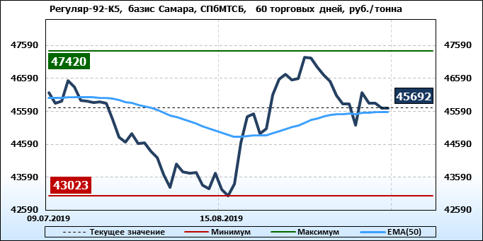 Цены на бензин Регуляр-92 класс 5, базис поставки Самара, торгуемые на СПбМТСБ, выросли за неделю на 524 рубля до 45692 рубля за тонну. Тренд на рынке бензина Регуляр-92-К5 на СПбМТСБ, базис поставки Самара, растущий.