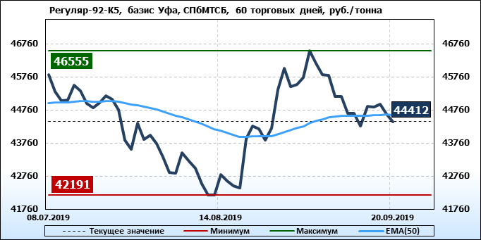 Цены на бензин Регуляр-92 класс 5, базис поставки Уфа, торгуемые на СПбМТСБ, выросли за неделю на 129 рублей до 44412 рубля за тонну. Тренд на рынке бензина Регуляр-92-К5 на СпбМТСБ, базис поставки Уфа, направлен вниз.