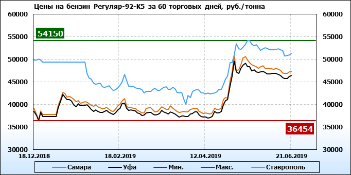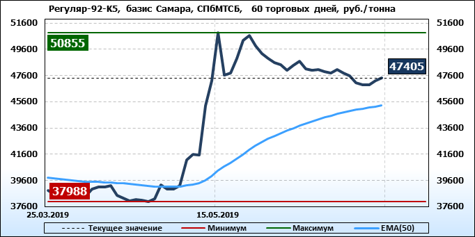 Цены на бензин Регуляр-92 класс 5, базис поставки Самара, торгуемые на СПбМТСБ, выросли за неделю на 47405 рублей до 47405 рублей за тонну. Тренд на рынке бензина Регуляр-92-К5 на СПбМТСБ, базис поставки Самара, растущий.