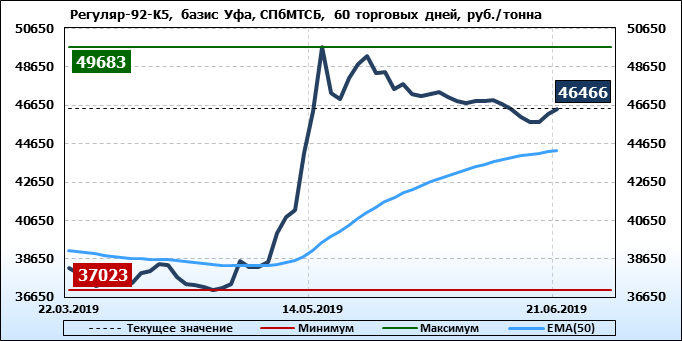 Цены на бензин Регуляр-92 класс 5, базис поставки Уфа, торгуемые на СПбМТСБ, упали за неделю на 5 рублей до 46466 рублей за тонну. Тренд на рынке бензина Регуляр-92-К5 на СпбМТСБ, базис поставки Уфа, направлен вверх.