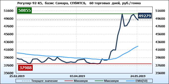 Цены на бензин Регуляр-92 класс 5, базис поставки Самара, торгуемые на СПбМТСБ, выросли за неделю на 1513 рубля до 49279 рублей за тонну. Тренд на рынке бензина Регуляр-92-К5 на СПбМТСБ, базис поставки Самара, растущий.