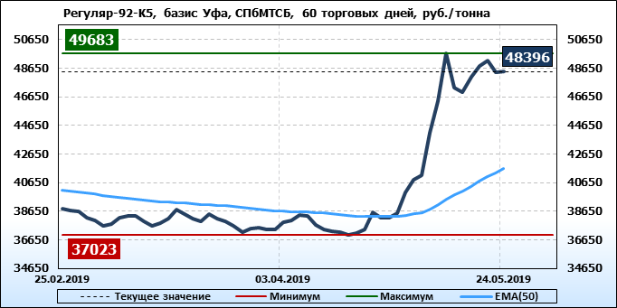 Цены на бензин Регуляр-92 класс 5, базис поставки Уфа, торгуемые на СПбМТСБ, выросли за неделю на 1438 рублей до 48396 рублей за тонну. Тренд на рынке бензина Регуляр-92-К5 на СпбМТСБ, базис поставки Уфа, направлен вверх.