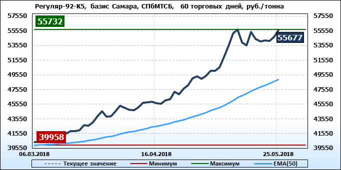 Цены на бензин Регуляр-92 класс 5, базис поставки Самара, торгуемые на СПбМТСБ, выросли за неделю на 1231 рубля до 55677 рублей за тонну. Тренд на рынке бензина Регуляр-92-К5 на СПбМТСБ, базис поставки Самара, растущий.