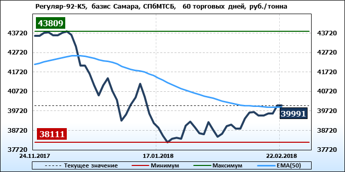 Цены на бензин Регуляр-92 класс 5, базис поставки Самара, торгуемые на СПбМТСБ, выросли за неделю на 504 рубля до 39 991 рубля за тонну. Тренд на рынке бензина Регуляр-92-К5 на СПбМТСБ, базис поставки Самара, растущий.