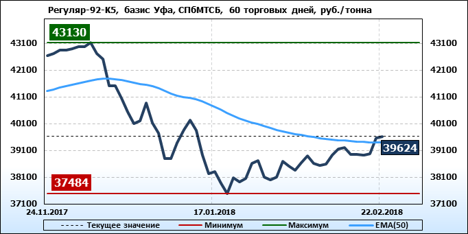 Цены на бензин Регуляр-92 класс 5, базис поставки Уфа, торгуемые на СПбМТСБ, выросли за неделю на 684 рубля до 39 624 рубля за тонну. Тренд на рынке бензина Регуляр-92-К5 на СпбМТСБ, базис поставки Уфа, направлен вверх.