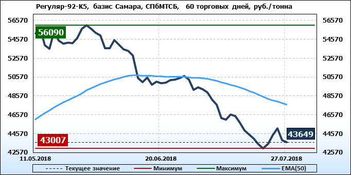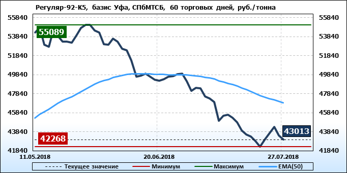Цены на бензин Регуляр-92 класс 5, базис поставки Уфа, торгуемые на СПбМТСБ, выросли за неделю на 745 рублей до 43013 рубля за тонну. Тренд на рынке бензина Регуляр-92-К5 на СпбМТСБ, базис поставки Уфа, направлен вниз.