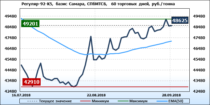 Цены на бензин Регуляр-92 класс 5, базис поставки Самара, торгуемые на СПбМТСБ, выросли за неделю на 435 рублей до 48625 рублей за тонну. Тренд на рынке бензина Регуляр-92-К5 на СПбМТСБ, базис поставки Самара, растущий.