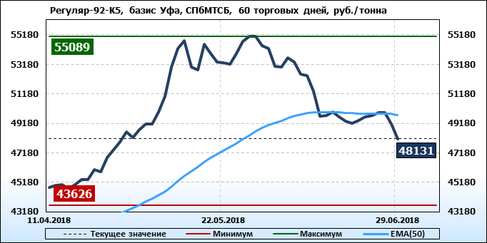 Цены на бензин Регуляр-92 класс 5, базис поставки Уфа, торгуемые на СПбМТСБ, упали за неделю на 1513 рубля до 48131 рубля за тонну. Тренд на рынке бензина Регуляр-92-К5 на СпбМТСБ, базис поставки Уфа, направлен вниз.