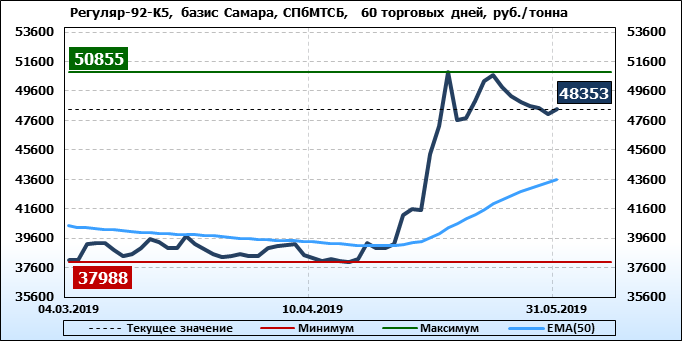 Цены на бензин Регуляр-92 класс 5, базис поставки Самара, торгуемые на СПбМТСБ, упали за неделю на 926 рублей до 48353 рубля за тонну. Тренд на рынке бензина Регуляр-92-К5 на СПбМТСБ, базис поставки Самара, растущий.