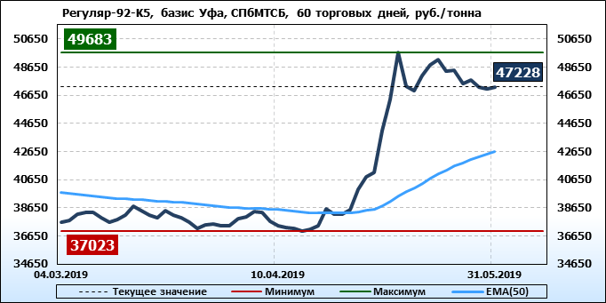 Цены на бензин Регуляр-92 класс 5, базис поставки Уфа, торгуемые на СПбМТСБ, упали за неделю на 1168 рублей до 47228 рублей за тонну. Тренд на рынке бензина Регуляр-92-К5 на СпбМТСБ, базис поставки Уфа, направлен вверх.