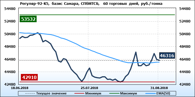 Цены на бензин Регуляр-92 класс 5, базис поставки Самара, торгуемые на СПбМТСБ, выросли за неделю на 832 рубля до 46316 рублей за тонну. Тренд на рынке бензина Регуляр-92-К5 на СПбМТСБ, базис поставки Самара, растущий.