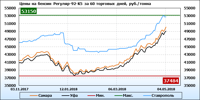 Цены на бензин Регуляр-92 класс 5, базис поставки Самара, торгуемые на СПбМТСБ, выросли за неделю на 1978 рублей до 50106 рублей за тонну. Тренд на рынке бензина Регуляр-92-К5 на СПбМТСБ, базис поставки Самара, растущий.