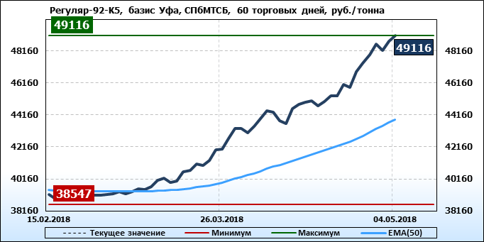 Цены на бензин Регуляр-92 класс 5, базис поставки Уфа, торгуемые на СПбМТСБ, выросли за неделю на 1743 рубля до 49116 рублей за тонну. Тренд на рынке бензина Регуляр-92-К5 на СпбМТСБ, базис поставки Уфа, направлен вверх.