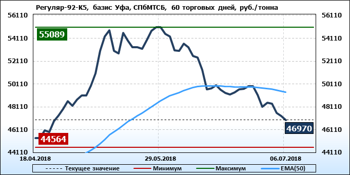 Цены на бензин Регуляр-92 класс 5, базис поставки Уфа, торгуемые на СПбМТСБ, упали за неделю на 1161 рубля до 46970 рубля за тонну. Тренд на рынке бензина Регуляр-92-К5 на СпбМТСБ, базис поставки Уфа, направлен вниз.