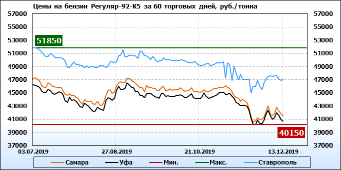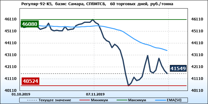 Цены на бензин Регуляр-92 класс 5, базис поставки Самара, торгуемые на СПбМТСБ, упали за неделю на 63 рубля до 41549 рублей за тонну. Тренд на рынке бензина Регуляр-92-К5 на СПбМТСБ, базис поставки Самара, падающий.