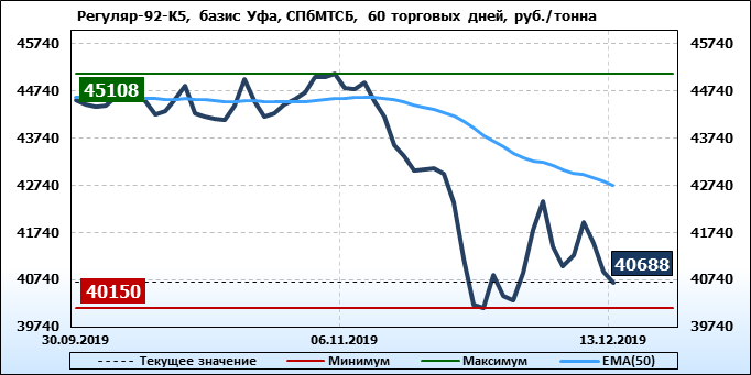 Цены на бензин Регуляр-92 класс 5, базис поставки Уфа, торгуемые на СПбМТСБ, упали за неделю на 342 рубля до 40688 рублей за тонну. Тренд на рынке бензина Регуляр-92-К5 на СпбМТСБ, базис поставки Уфа, направлен вниз.
