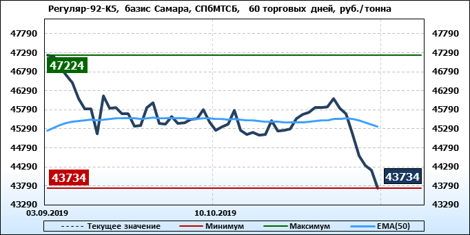 Цены на бензин Регуляр-92 класс 5, базис поставки Самара, торгуемые на СПбМТСБ, упали за неделю на 1956 рублей до 43734 рубля за тонну. Тренд на рынке бензина Регуляр-92-К5 на СПбМТСБ, базис поставки Самара, падающий.