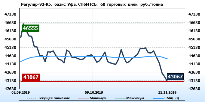 Цены на бензин Регуляр-92 класс 5, базис поставки Уфа, торгуемые на СПбМТСБ, упали за неделю на 1859 рублей до 43067 рублей за тонну. Тренд на рынке бензина Регуляр-92-К5 на СпбМТСБ, базис поставки Уфа, направлен вниз.