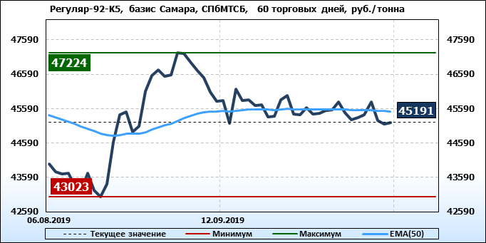 Цены на бензин Регуляр-92 класс 5, базис поставки Самара, торгуемые на СПбМТСБ, упали за неделю на 145 рублей до 45191 рубля за тонну. Тренд на рынке бензина Регуляр-92-К5 на СПбМТСБ, базис поставки Самара, падающий.