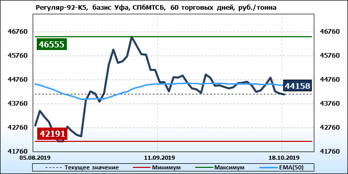 Цены на бензин Регуляр-92 класс 5, базис поставки Уфа, торгуемые на СПбМТСБ, упали за неделю на 168 рублей до 44158 рублей за тонну. Тренд на рынке бензина Регуляр-92-К5 на СпбМТСБ, базис поставки Уфа, направлен вниз.