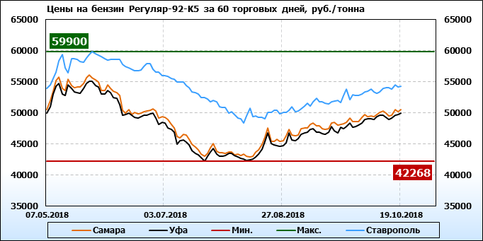 Цены на бензин Регуляр-92 класс 5, базис поставки Уфа, торгуемые на СПбМТСБ, выросли за неделю на 731 рубля до 49997 рублей за тонну. Тренд на рынке бензина Регуляр-92-К5 на СпбМТСБ, базис поставки Уфа, направлен вверх.