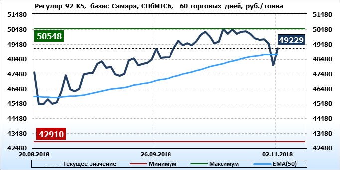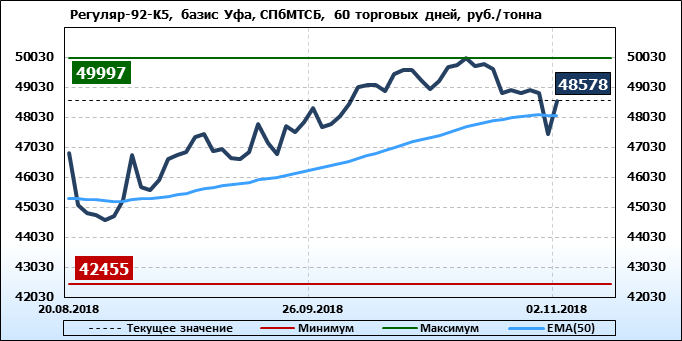 Цены на бензин Регуляр-92 класс 5, базис поставки Уфа, торгуемые на СПбМТСБ, упали за неделю на 369 рублей до 48578 рублей за тонну. Тренд на рынке бензина Регуляр-92-К5 на СпбМТСБ, базис поставки Уфа, направлен вверх.