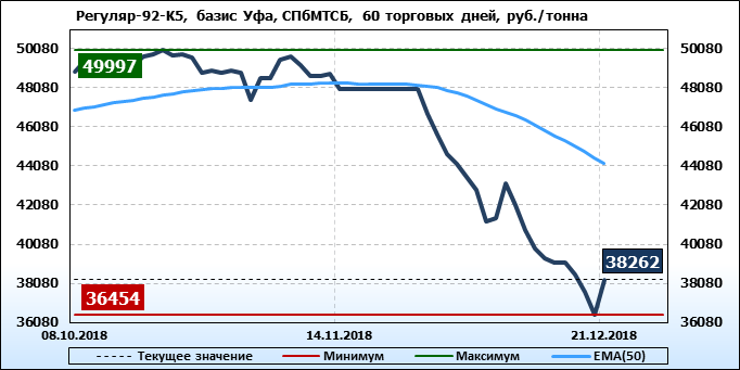 Цены на бензин Регуляр-92 класс 5, базис поставки Уфа, торгуемые на СПбМТСБ, упали за неделю на 856 рублей до 38262 рублей за тонну. Тренд на рынке бензина Регуляр-92-К5 на СпбМТСБ, базис поставки Уфа, направлен вниз.