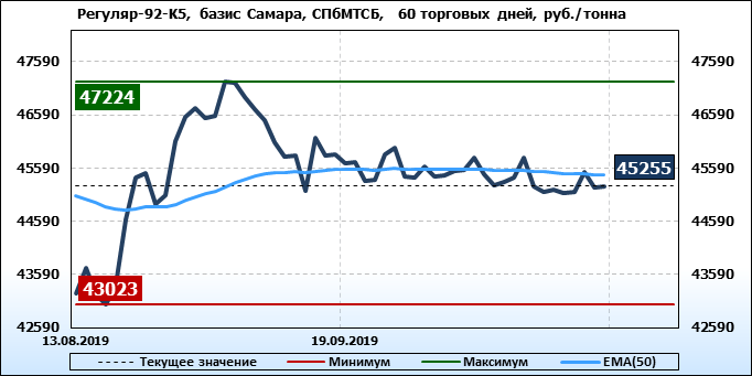 Цены на бензин Регуляр-92 класс 5, базис поставки Самара, торгуемые на СПбМТСБ, выросли за неделю на 45255 рублей до 45255 рублей за тонну. Тренд на рынке бензина Регуляр-92-К5 на СПбМТСБ, базис поставки Самара, падающий.