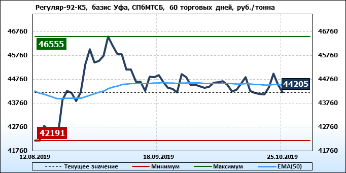 Цены на бензин Регуляр-92 класс 5, базис поставки Уфа, торгуемые на СПбМТСБ, выросли за неделю на 47 рублей до 44205 рублей за тонну. Тренд на рынке бензина Регуляр-92-К5 на СпбМТСБ, базис поставки Уфа, направлен вниз.