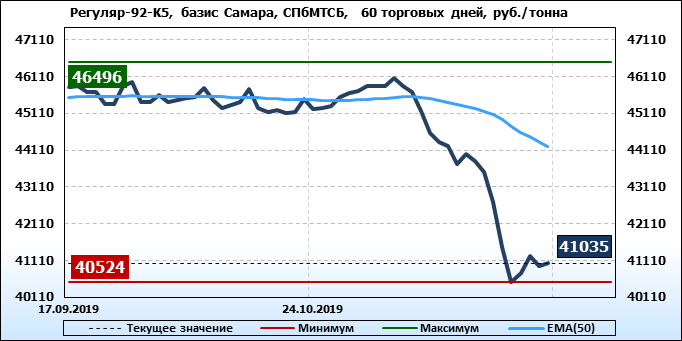 Цены на бензин Регуляр-92 класс 5, базис поставки Самара, торгуемые на СПбМТСБ, упали за неделю на 436 рублей до 41035 рублей за тонну. Тренд на рынке бензина Регуляр-92-К5 на СПбМТСБ, базис поставки Самара, падающий.