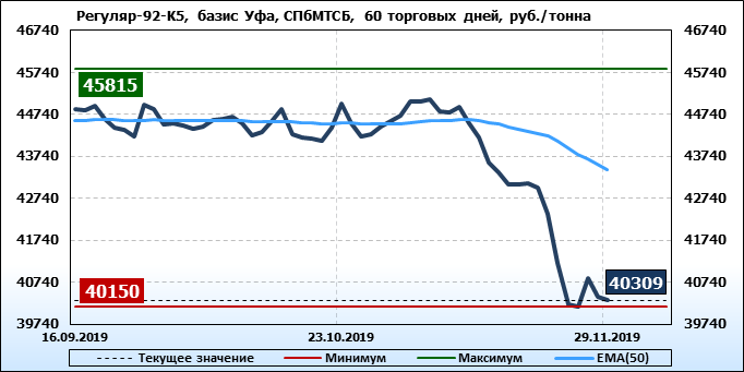 Цены на бензин Регуляр-92 класс 5, базис поставки Уфа, торгуемые на СПбМТСБ, упали за неделю на 885 рублей до 40309 рублей за тонну. Тренд на рынке бензина Регуляр-92-К5 на СпбМТСБ, базис поставки Уфа, направлен вниз.