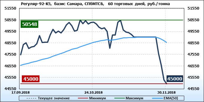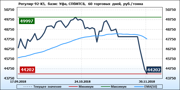 Цены на бензин Регуляр-92 класс 5, базис поставки Уфа, торгуемые на СПбМТСБ, упали за неделю на 3800 рубля до 44202 рубля за тонну. Тренд на рынке бензина Регуляр-92-К5 на СпбМТСБ, базис поставки Уфа, направлен вниз.
