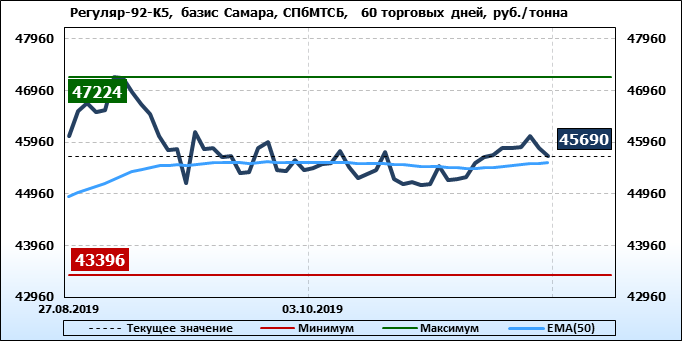 Цены на бензин Регуляр-92 класс 5, базис поставки Самара, торгуемые на СПбМТСБ, упали за неделю на 163 рубля до 45690 рубля за тонну. Тренд на рынке бензина Регуляр-92-К5 на СПбМТСБ, базис поставки Самара, растущий.