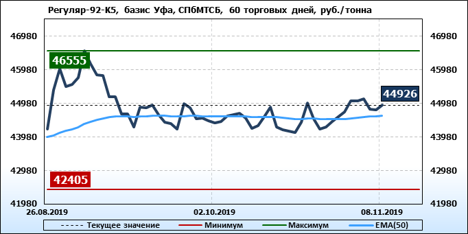 Цены на бензин Регуляр-92 класс 5, базис поставки Уфа, торгуемые на СПбМТСБ, упали за неделю на 117 рублей до 44926 рублей за тонну. Тренд на рынке бензина Регуляр-92-К5 на СпбМТСБ, базис поставки Уфа, направлен вверх.