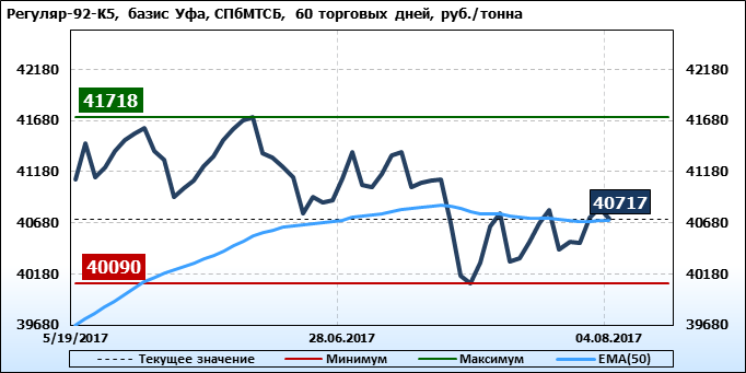 Цены на бензин Регуляр-92 класс 5, базис поставки Уфа, торгуемые на СПбМТСБ, выросли за неделю на 297 рублей до 40717 рублей за тонну. Тренд на рынке бензина Регуляр-92-К5 на СпбМТСБ, базис поставки Уфа, направлен вверх.