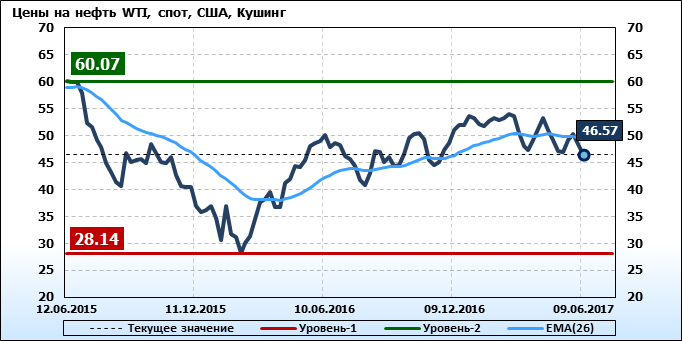 Цены на нефть сорта WTI с базиса поставки Кушинг упали на -1.91 до 46.57 долларов за баррель. Тренд на рынке WTI медвежий. Цена на сорт MARS упала на -0.85 до 44.57 долларов за баррель.
