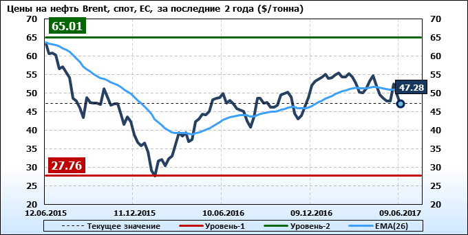 Цены на нефть сорта Brent с поставкой из портов ЕС упали на -2.95 до 47.28 долларов за баррель. Тренд на рынке Brent падающий.