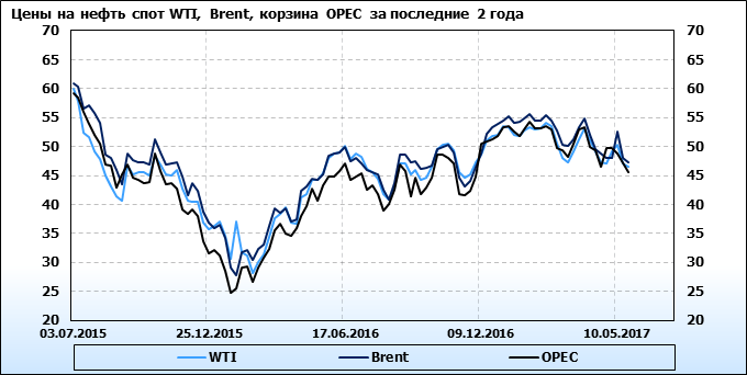 Цены на корзину сортов нефти стран членов ОПЕК упали на -1.83 до 45.49 долларов за баррель. Ценовая тенденция по корзине ОПЕК направлена вниз. Цена на сорт Oman упала на -0.8 до 47.21 долларов за баррель.