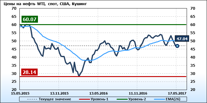 Цены на нефть сорта WTI с базиса поставки Кушинг упали на -0.21 до 47 долларов за баррель. Тренд на рынке WTI медвежий.