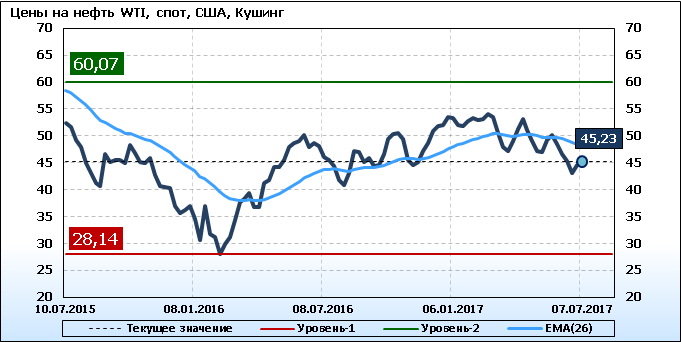 Цены на нефть сорта WTI с базиса поставки Кушинг выросли на 0,6 до 45,23 долларов за баррель. Тренд на рынке WTI медвежий.