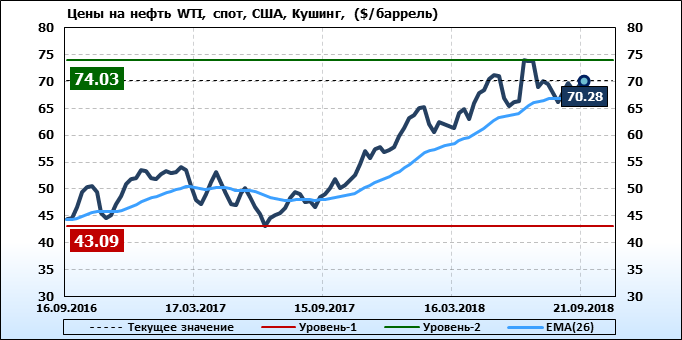 Цены на нефть сорта WTI с базиса поставки Кушинг выросли на 1.32 до 70.28 долларов за баррель. Тренд на рынке WTI бычий.