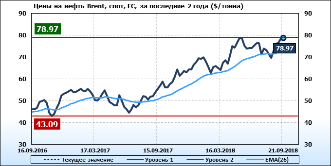 Цены на нефть сорта Brent с поставкой из портов ЕС выросли на 0.86 до 78.97 долларов за баррель. Тренд на рынке Brent растущий.