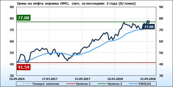 Цены на корзину сортов нефти стран членов ОПЕК выросли на 1.03 до 77.08 долларов за баррель. Ценовая тенденция по корзине ОПЕК направлена вверх.