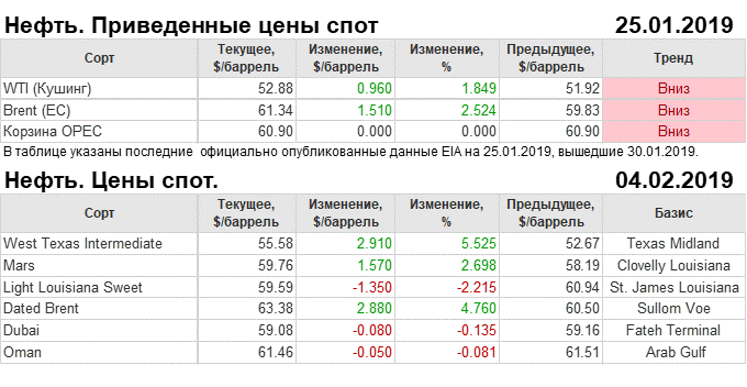 Цены спот на нефть по сортам и базисам. Данные на 04.02.2019