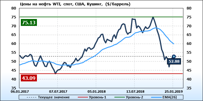 Цены на нефть сорта WTI с базиса поставки Кушинг выросли на 0.96 до 52.88 долларов за баррель. Тренд на рынке WTI медвежий.