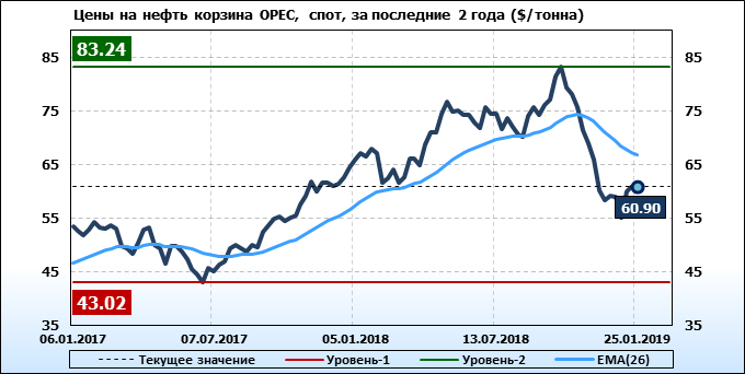 Цены на корзину сортов нефти стран членов ОПЕК не изменились и составляют 60.9 долларов за баррель. Ценовая тенденция по корзине ОПЕК направлена вниз.