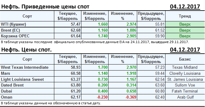 Цены спот на нефть по сортам и базисам. Данные на 04.12.2017