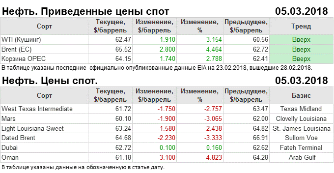 Цены спот на нефть по сортам и базисам. Данные на 05.03.2018